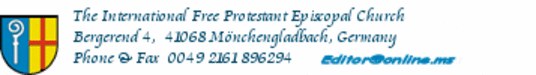 10:55:29 - 2006-06-19 Welcome to The International Free Protestant Episcopal Church® See of the Bishop Primus Bergerend 4 41068 Mönchengladbach, NRW Germany +49 2161 89 59 - Editor@online.ms THE INTERNATIONAL FREE PROTESTANT EPISCOPAL CHURCH® A teacher must also be a learner, and therefore only he who continues to learn is competent to continue to teach. Nothing but new lessons, daily mastered, can keep testimony fresh and vitalizing and enable us to give advance lessons. Instead of being always engaged in a sort of review, our teaching and testimony will thus be drawn each day from a new and higher level. ----------------- The Teaching Office Of The Church Can. 1 - §1 It is the obligation and inherent right of the Church, independent of any human authority, to preach the Gospel to all peoples, using for this purpose even its own means of social communication, for it is to the Church that Christ the Lord entrusted the deposit of faith, so that by the assistance of the Holy Spirit, it might conscientiously guard revealed truth, more intimately penetrate it, and faithfully proclaim and expound it.